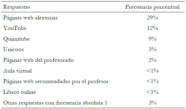 La situación más repetida es que usaban webs aleatorias: «webs que me recomienda el buscador», «páginas aleatorias», etc. También destacaba la presencia de Youtube (12%) (y de algunos de sus canales con contenidos propios de las materias científicas como Unicoos o Quimitube); esta última debido a la creciente presencia de canales en los que se ofrece al visitante problemas resueltos, vídeos con explicaciones de contenido, etc. De hecho, son muy utilizados por el alumnado de secundaria, bachillerato y primeros cursos de Grado.