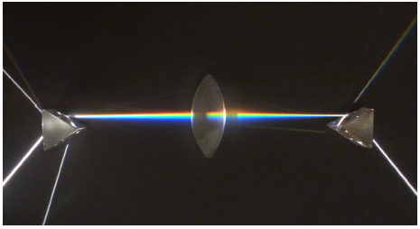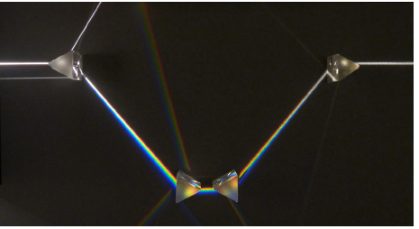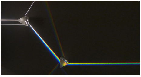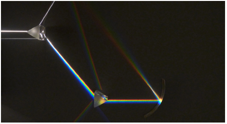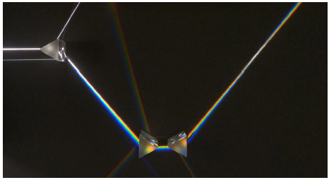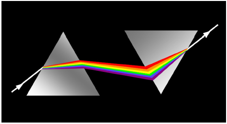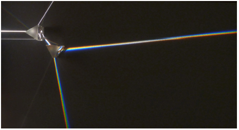 Un rayo de luz blanca que incide en un primer prisma se refracta, es descompuesto en sus colores constituyentes y llega a un segundo prisma invertido respecto al primero. Los diferentes colores que emergen del segundo prisma son paralelos al rayo inicial. La fotografía muestra también las reflexiones y refracciones secundarias que tienen lugar en las distintas caras de los prismas.