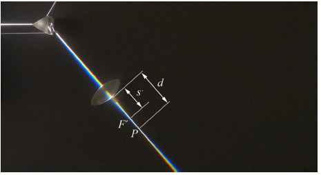 Un rayo de luz blanca incide sobre un prisma y el espectro de colores que emerge se hace llegar sobre una lente biconvexa. Los colores convergen en un punto, P, que se encuentra a una distancia d mayor que la distancia focal posterior, s’. En ese punto se consigue luz blanca.