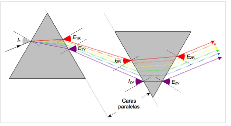 Formación del espectro visible con dos prismas ópticos, cuando el segundo está invertido 180º respecto al primero. Debido a las refracciones que se producen en los dos prismas, los diferentes colores emergen finalmente separados. Los rayos que emergen (por la derecha) del segundo prisma son paralelos al rayo incidente (por la izquierda) de luz blanca, por lo que son también paralelos entre sí.