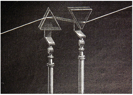 Supuesto comportamiento de la luz blanca en un montaje con dos prismas, según Guillemin (1868). Los rayos que se propagan entre esos prismas aparecen paralelos, cuando en realidad son divergentes. Finalmente, el rayo que emerge del segundo prisma tiene (erróneamente) igual anchura que el rayo blanco incidente.