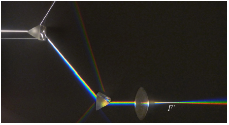 El haz de rayos coloreados que emerge del montaje con dos prismas llega a una lente biconvexa. Esos rayos se refractan pasando por el foco, F’, donde se obtiene luz blanca.
