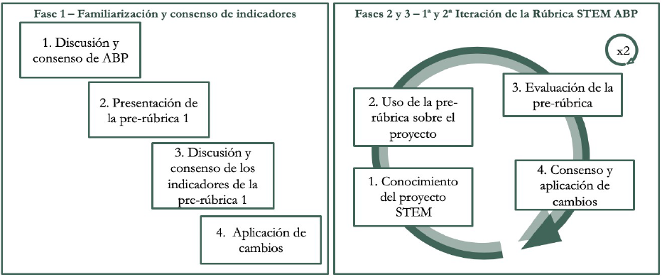 En las fases 2 y 3 del proceso de co-construcción y validación se aplicaron las pre-rúbricas 2 y 3, respectivamente, a dos proyectos STEM con el objetivo de centrar la discusión en la aplicabilidad de los indicadores sobre ejemplos concretos.
