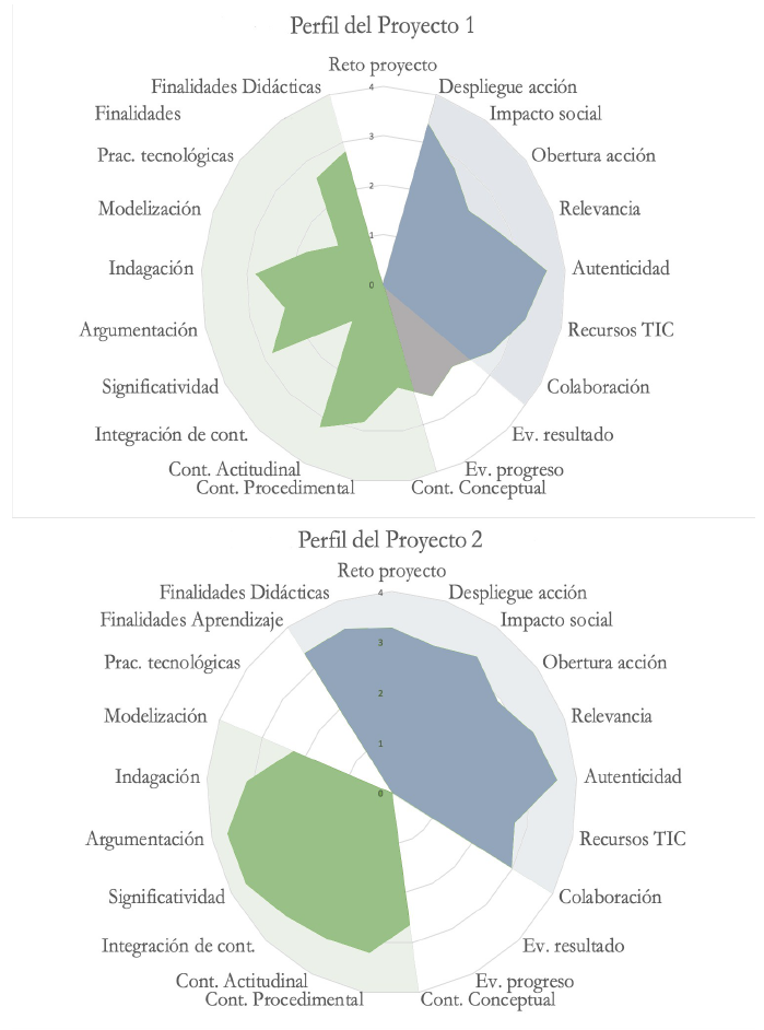 En esta investigación, hemos usado esta distinción de objetivos para dividir los indicadores de la rúbrica entre aquellos que se relacionan con la consecución de los objetivos de aprendizaje específicos y aquellos indicadores que contribuyen a la consecución de objetivos meta-disciplinares, que generalmente se desarrollan en contextos de ABP. En los gráficos de la Figura 2, los primeros se indican en color azul y los segundos en verde, permitiendo identificar perfiles de proyectos según qué finalidades prioricen.