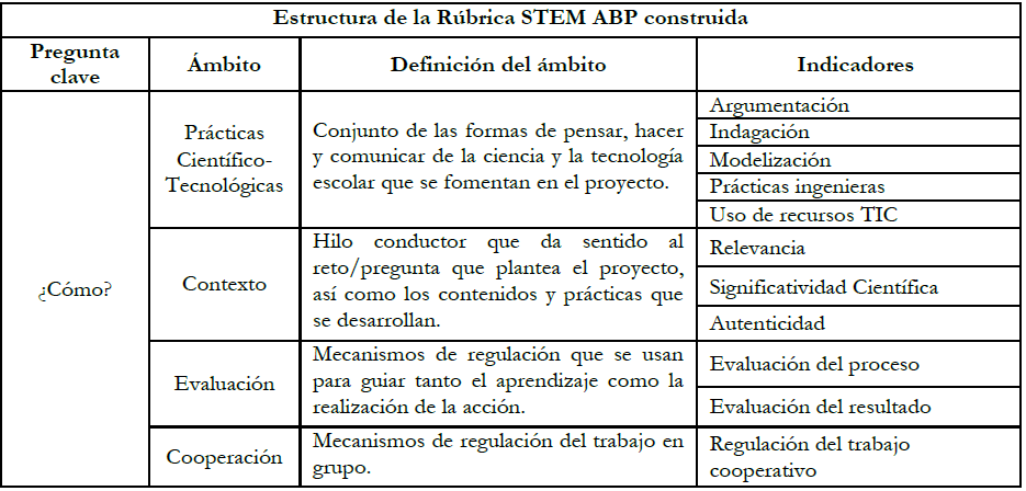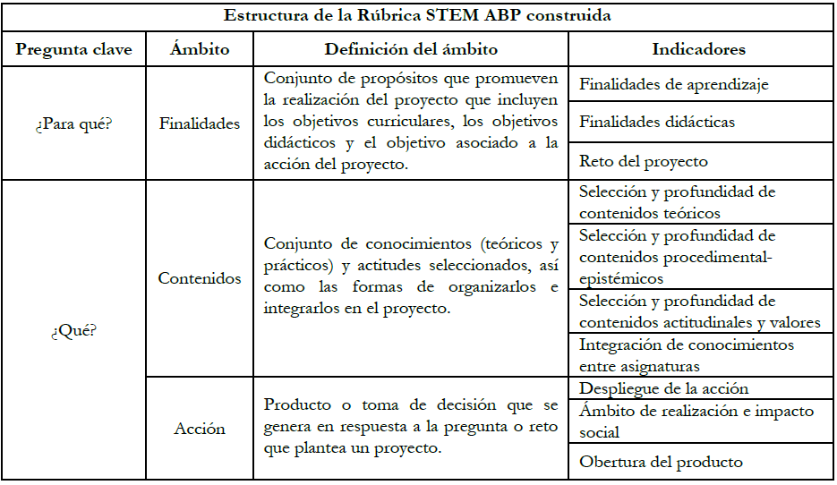 Después de la doble iteración realizada se obtuvo una versión final de la rúbrica que se presenta como un producto final de este proceso de co-construcción. Ésta comprende 7 ámbitos de los proyectos STEM que agrupan 21 indicadores (Tabla 1). Para cada indicador se especifican 4 niveles de resultado que proponen un orden progresivo de mejora, para los que se incluyen descriptores que ejemplifican sus características (Anexo 1).