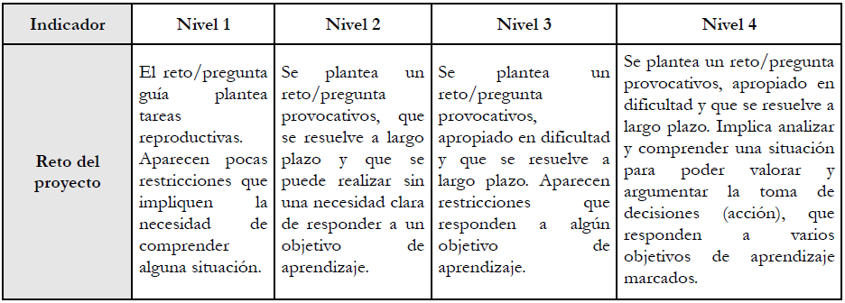 En la Fase 1 (consenso de indicadores) y en la Fase 2 (1ª iteración) de esta co-construcción se hacen valoraciones, tanto generales como en relación al proyecto analizado, que ponen en cuestión la posibilidad de diseñar proyectos STEM que sirvan para construir ideas en profundidad (que modelicen a nivel 3 o 4) y a la vez alcancen niveles altos de los indicadores asociados al ámbito de acción (que implican poner en práctica y evaluar una acción real, y que repercuta a un público externo). Así aparecen opiniones como la del participante E que pone en valor proyectos con menor impacto social pero que profundizan en aquellas competencias que se desean desarrollar en el alumnado: «tal vez lo hacemos muy bien [construir ideas clave], y hemos de valorar que está muy bien hecho, pero, a cambio, nos hemos quedado en el aula…» A parte de los indicadores de la rúbrica mencionados, esta tensión se aprecia en la progresión de niveles del indicador Reto del proyecto, que evoluciona desde proyectos que proponen retos con tareas reproductivas, a retos más sofisticados que implican comprender en profundidad una situación para tomar decisiones (Tabla 2), donde esta tensión entre acción y modelización se hace más intensa.