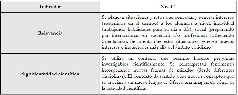 Esta tensión presentada se aprecia en gran medida en los niveles superiores de los indicadores de Relevancia y Significatividad científica en la rúbrica (Tabla 4), donde contextos muy significativos para la ciencia (que planteen preguntas investigables científicamente) pueden entrar en conflicto con contextos muy relevantes personal y socialmente (que conecten con intereses sostenidos a nivel global, individual o profesional).