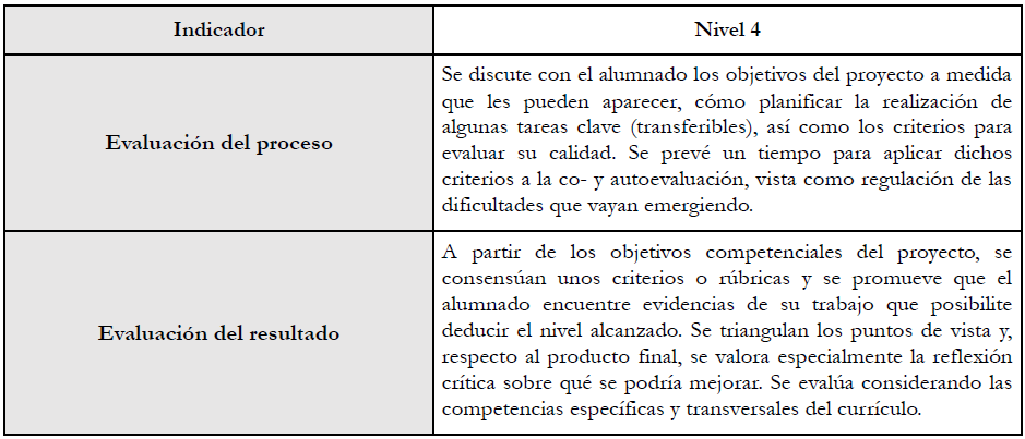 En la discusión sobre el proyecto 1 (Fase 2) surgió una cuarta tensión entre la forma de trabajar la competencia científica (los nuevos contenidos curriculares) y la forma de evaluarla en proyectos STEM. La falta de estrategias claras que documenten y recojan pruebas del aprendizaje más allá del producto final (y/o subproductos parciales), ponen en evidencia la dificultad de evaluar el nivel de competencia alcanzado al finalizar un proyecto. Así mismo, en la evaluación de este proceso de aprendizaje, aparecen dificultades en hallar espacios de regulación que permitan reflexionar sobre el desarrollo de la competencia científica y el desarrollo del proyecto (sus etapas, productos parciales, etc) de forma paralela. Esta situación se ve reflejada en el diálogo de los participantes al no encontrar herramientas que permitan evaluar la competencia científica de forma específica y que acaben valorando otros elementos como el grado de implicación en el proyecto. Esta tensión se refleja en los niveles superiores de los indicadores relativos al ámbito de Evaluación, que resaltan la importancia de conectar el conjunto de objetivos de aprendizaje con las tareas que se realizan durante el proyecto, tanto en la evaluación del resultado como del proceso. (Tabla 5).