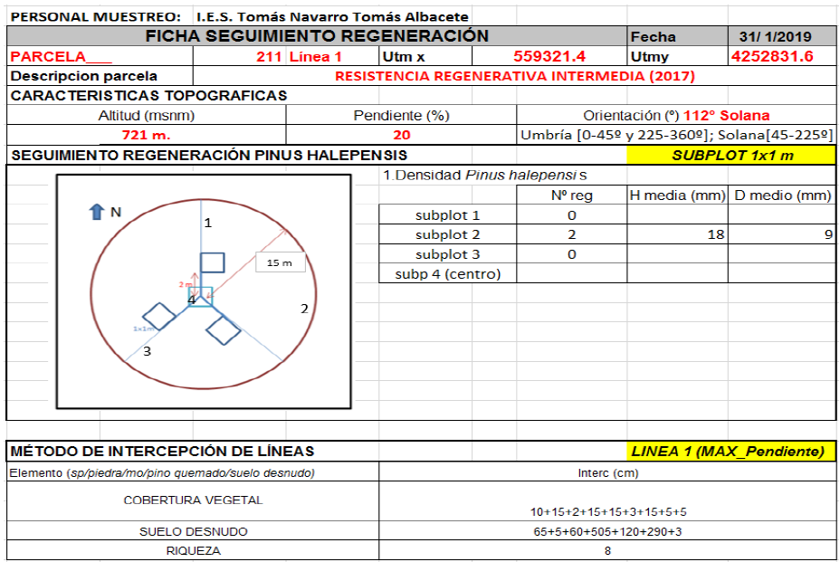 A lo largo de cada uno de los tres radios trazados del círculo, se anotó la longitud de la cinta situada encima del suelo desnudo y la longitud de la cobertura vegetal interceptada, así como sus características. Más tarde, se clasificó cada individuo interceptado como hierba, arbusto o árbol, haciendo énfasis en la especie P. Halepensis, puesto que es la que compone principalmente los bosques de esta zona. Finalmente, toda esta información fue procesada mediante una hoja de cálculo (figura 7).