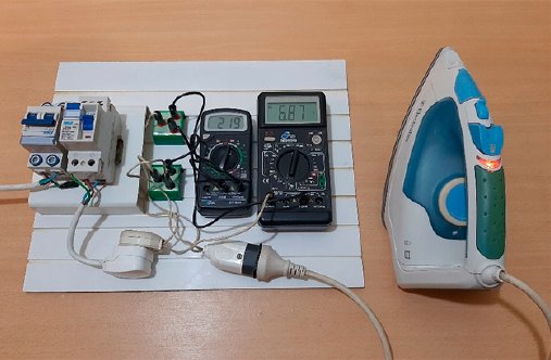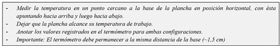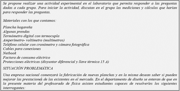 Si bien en la plancha puede estar indicada la potencia eléctrica, se consideró conveniente, junto a los estudiantes, determinarla con amperímetro y voltímetro. Por un lado, es posible que la plancha no tenga las características técnicas a la vista y, por otro lado, la potencia indicada puede diferir de la real (además ésta depende de la tensión eléctrica, la que suele tener variaciones). En este artefacto, para el circuito eléctrico puede considerarse un modelo puramente resistivo, lo cual podría ser una ventaja al simplificar el cálculo para corriente alterna.