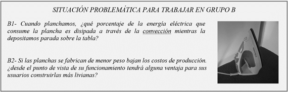 Para dar respuesta a la actividad B1 se reguló la temperatura “para prendas de algodón”. En esta situación la misma fluctuó entre 176 °C y 188 °C (medido con termopar). Debido a que el funcionamiento es intermitente se tuvo que determinar la potencia eléctrica media, a partir de la instantánea (midiendo tensión y corriente) y de cronometrar los intervalos de funcionamiento (7 segundos de calentamiento dentro de un período de 125 segundos). Para el cálculo de la radiación se consideró un modelo sencillo que tomó un valor de temperatura comprendido entre los dos anteriores; esto es equivalente a tomar la temperatura constante de un estado estacionario. De este modo se determinó que, para una plancha con una potencia superior a 1000 W, la potencia radiada toma un valor sorprendentemente bajo, algo menos de 40 W para un área emisora de 0,013 m., pero tal vez no lo sea tanto si se compara con la potencia media eléctrica media obtenida que fue de 107 W (apenas el 7 % de la potencia instantánea medida). Con estos resultados la respuesta a la consigna inicial del grupo B es que la convección, restando a la potencia eléctrica media la de radiación y despreciando la conducción por el aire por ser un mal conductor del calor, alcanza algo más del 62 %. Naturalmente, un aspecto crucial de la enseñanza de la física que subyace en el balance de energía hecho con los estudiantes, es el de la conservación de la misma.