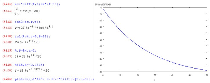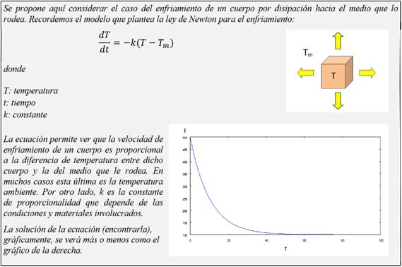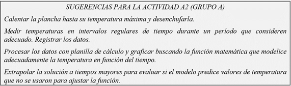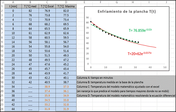 Sabemos de la teoría (ley de enfriamiento de Newton) que la temperatura de un cuerpo enfriándose en un medio puede modelizarse con una exponencial decreciente T(t), que es la solución de la ecuación diferencial correspondiente. Se propuso comprobar empíricamente con la plancha esta ley de enfriamiento. Para ello se sugirió medir la temperatura (con la plancha caliente pero desenchufada) a intervalos regulares de tiempo y graficar con algún software (Excel) que permita encontrar el modelo matemático. Se utilizó una termocupla para medir la temperatura a intervalos regulares de tiempo y, de forma adicional, el proceso se modelizó con el software libre Maxima, lo que permitió a los estudiantes encontrar la solución de la ecuación diferencial. Se entregó el material que se muestra a continuación (figuras 13 y 14).