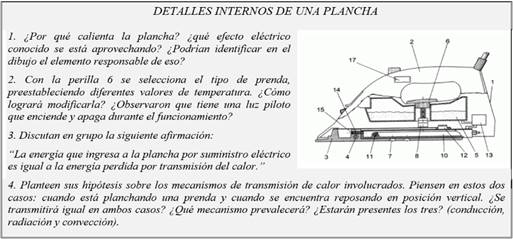 Iniciando la primera clase se dispusieron un par de planchas en el laboratorio para su prueba de funcionamiento. Luego, se pidió a los estudiantes analizar el modo de trabajo de una plancha típica a partir de un dibujo incluido en fotocopias acompañado por unas preguntas para orientar el análisis (figura 1). En esta etapa de trabajo se propusieron una serie de cuestiones cuyo objetivo fue poner de manifiesto la relación de diferentes partes del dispositivo estudiado con ciertos contenidos de física.