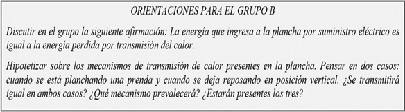 La pregunta de la consigna se vinculó con aspectos más conceptuales presentes en la actividad. Se esperó que, de la discusión en el grupo B, surgieran relaciones entre las características constructivas de la plancha y ciertas variables termodinámicas involucradas.
