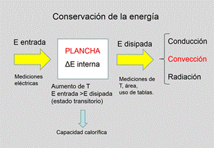 El método consistió en asumir que puede despreciarse la conducción del calor a través del aire. De este modo, se consideró que la energía eléctrica consumida por la plancha es disipada sólo a través de la convección y de la radiación. Dado que esta última es más sencilla de calcular, la convección se obtuvo restando a la energía eléctrica la disipada por radiación. La figura 18 muestra el esquema entregado para dicha deducción.