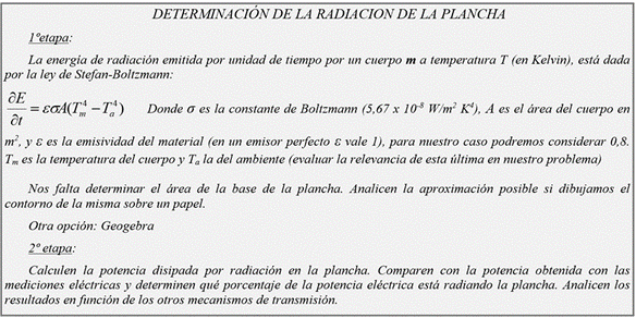 Poder hacer mediciones para determinar la disipación de energía, aún en un artefacto sencillo como una plancha es dificultoso. De los tres mecanismos conocidos, claramente, el más complicado es la convección. Por otro lado, la conducción puede ser difícil de calcular debido a condiciones de frontera complejas en el contacto con la prenda. Entonces, a los efectos de que los estudiantes puedan cuantificar algún proceso de disipación, se sugirió considerar la radiación de la plancha sin contacto con la tela (de ahí surge la situación problemática presentada).