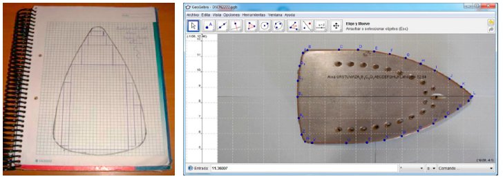 Para el cálculo de la radiación se requirió cuantificar el área de la superficie emisora. Si bien, en el proceso de modelización podría aproximarse a un triángulo, se propuso estimarla recurriendo a un antiguo método (aunque didáctico), que consiste en inscribir rectángulos dentro de la silueta de la base utilizando papel cuadriculado y sumar sus áreas correspondientes (ver figura 20, izquierda). Además de esto, se consideró una oportunidad de utilizar una función específica del software Geogebra. Con este programa pudo determinarse el área de la base a partir del área de su imagen (fotografiada en el laboratorio y mostrada en la figura 20, derecha) recurriendo a la función “polígono”. Se convierten en m. las unidades de área que brinda el programa planteando la proporción correspondiente a partir de una de sus dimensiones (con el programa también pueden medirse segmentos en unidades de longitud). La relación entre ambas áreas es proporcional al cuadrado de la relación entre una dimensión de la plancha y la correspondiente en la imagen.