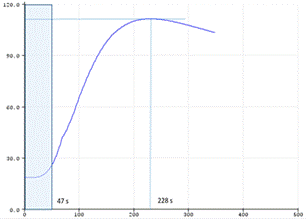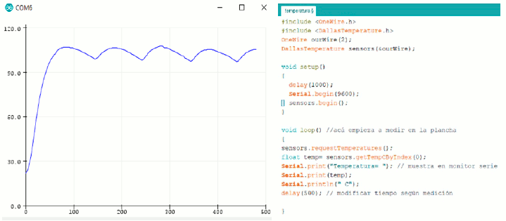 Se conectó una plancha y se registraron los valores de temperatura a lo largo de un período de tiempo tal que permitió construir una curva de calentamiento y enfriamiento (figura 3). Para esto se utilizó una placa Arduino Uno con un sensor DS18B20. Se realizó un análisis cualitativo de dicha curva.