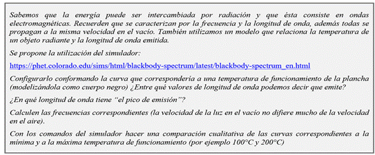 Después de la modelización de la radiación se presenta una consigna más guiada (figura 6), relacionada con la anterior, para conseguir valores de temperatura y es introductoria a otra actividad de la secuencia.