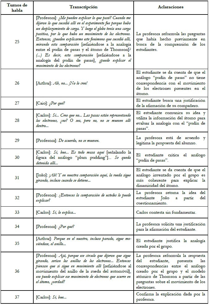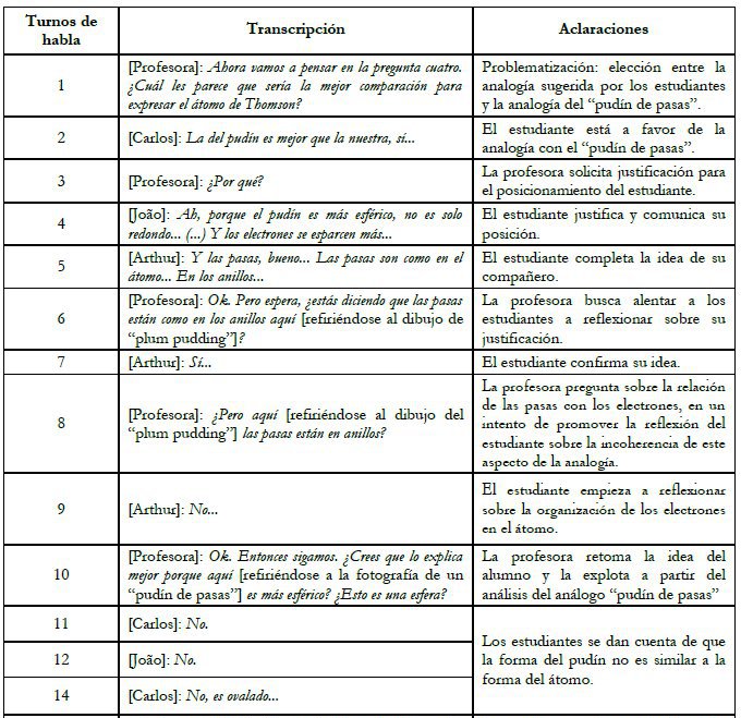Notamos que cuando la profesora usó su discurso para legitimar una idea presentada por el estudiante (turno 29), él posteriormente critica (turno 30) una característica del análogo “pudín de pasas” que estaría en contra de sus ideas sobre el átomo. Según Kelly y Licona (2018), cuando el docente utiliza la práctica del metadiscurso, que consiste en un proceso de legitimación del discurso del estudiante, puede brindar oportunidades para la participación e implicación de los estudiantes con las prácticas epistémicas. En este caso, observamos que el apoyo de la docente favoreció la implicación del estudiante y el desarrollo de la autonomía para criticar la información del libro de texto.