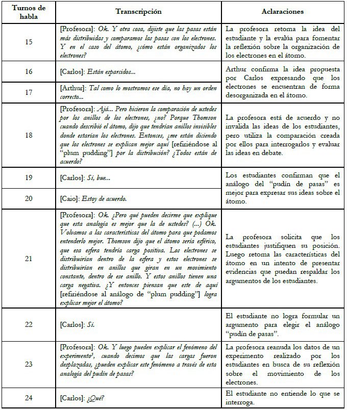 Por lo tanto, en un segundo momento, cuando los estudiantes corroboraron sus proposiciones y se convencieron de su validez, se implicaron en interacciones interpersonales con sus compañeros en defensa de la analogía que ellos mismos habían creado. Autores del área (Jiménez-Aleixandre, 2000; Chiaro y Leitão, 2004) argumentan que no es común que los estudiantes encuentren lagunas en las explicaciones de sus compañeros ni que se involucren en interacciones para evaluar y criticar las ideas que surgen en la esfera social. Los datos de esta investigación muestran que, después del momento de interacción con el profesor, en el que él brindó un status epistémico (Chiaro y Leitão, 2004) a las ideas de los estudiantes, demostraron autoridad para criticar la analogía con el “pudín de pasas”, lograron identificar lagunas en las comparaciones presentadas por sus compañeros, evaluaron las ideas que surgieron en el ámbito social y argumentaron en defensa de esas ideas personales. Al identificar esta relación entre la implicación de los estudiantes y la forma en que la docente condujo la discusión, notamos que nuestros resultados son congruentes con los del trabajo de Araújo y Mortimer (2009), que llaman la atención sobre el hecho de que la participación de los estudiantes en las actividades del aula de Química están directamente relacionadas con las estrategias utilizadas por el docente.