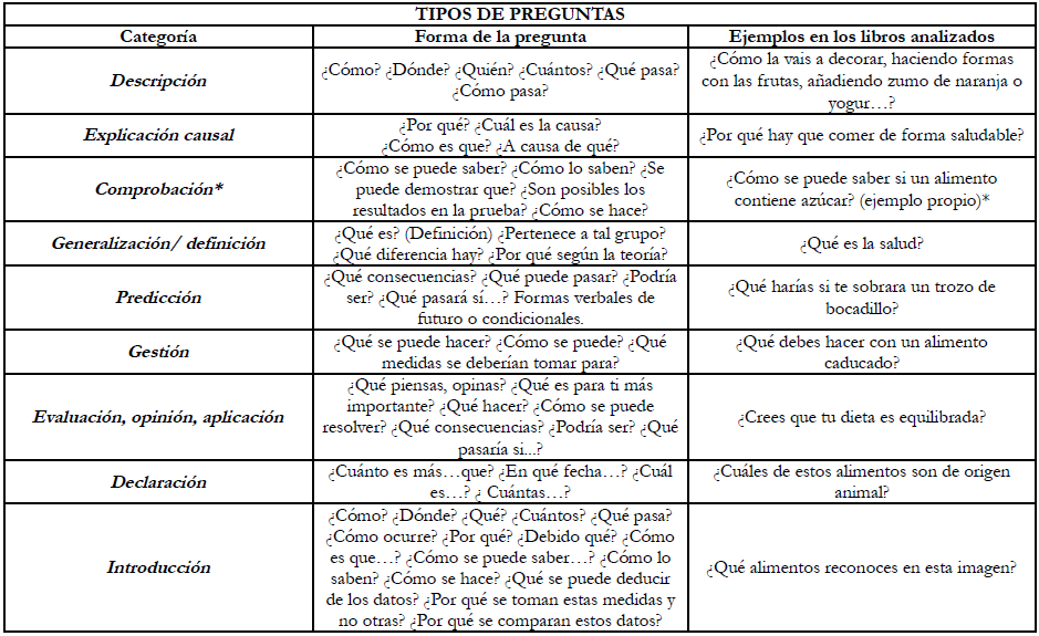 Abrandt-Dahlgren y Öberg (2001) plantean una categorización de las preguntas que recoge cinco tipos diferentes: enciclopédicas, de comprensión, relacionales, de evaluación y de búsqueda de soluciones. A partir de esta categorización, autoras como Leite et al. (2012) y Martins et al. (2014) señalan que las preguntas enciclopédicas implicarían un nivel cognitivo inferior al resto ya que no requieren necesariamente reflexión o comprensión de los temas. Del mismo modo, también indican que con un enfoque de la enseñanza basado en «… una metodología tradicional, apoyada en la lectura del manual, (…) podemos encontrar una justificación plausible de la dificultad de los estudiantes para plantear cuestiones de un nivel cognitivo más exigente. Por lo tanto, se entiende que, de acuerdo con otros estudios, a los estudiantes no se les enseñó a cuestionar» (Martins et al. 2014, p. 255).