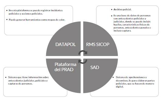 Según la entrevista realizada a la oficial Enríquez (2019), la policía de México cuenta con la "Plataforma México", donde se encuentra toda la base de la información y data policial. El sistema cuenta con diferentes usuarios con privilegios diferenciados según el perfil de puesto de cada policía. Es una herramienta primordial en materia de investigación, debido a que su análisis de la información permite realizar el trabajo preventivo del delito en materia policial. Este sistema integra las bases de datos de vehículos, armamentos, personas e información de Interpol, lo cual permite el despliegue operativo de la Policía Federal. Las policías nacionales y estatales participan en la alimentación de este sistema de datos, principalmente de personas detenidas. Sin embargo, la entrevistada señala que lo complejo de la plataforma, es la "alimentación" de la información, debido a que no es automatizada y depende de la disponibilidad del recurso humano. Se visualiza un desfase de información con respecto a la realidad. Además, hasta el momento no cuenta con un equipo que permita la alimentación "en vivo" como ejemplo el uso de handhell.