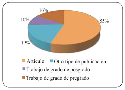 El tipo de documento más representativo corresponde a artículos (32 documentos), seguido de otros tipos de publicaciones realizadas por entidades públicas y privadas (11), trabajos de grado de pregrado (9) y posgrado (6) (gráfica 1).