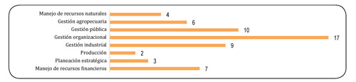 Se identificaron ocho objetivos de medición de eficiencia en los documentos analizados, estos fueron: manejo de recursos naturales, gestión agropecuaria, gestión pública, gestión organizacional, gestión industrial, producción, planeación estratégica y manejo de recursos financieros (gráfica 11). El objetivo más relevante fue el de gestión organizacional (17 estudios), seguido por gestión pública (10 estudios) y gestión industrial (9 estudios).