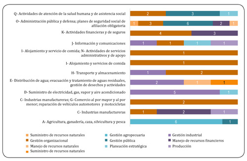Por otra parte, con respecto a la aparición de la frecuencia de los objetivos de medición de eficiencia por sección CIIU según gráfica 12; el más representativo es la gestión organizacional que aparece en nueve secciones del CIIU con 17 investigaciones en total: actividades financieras y de seguros (4 aplicaciones); administración pública y defensa, planes de seguridad social de afiliación obligatoria (3); actividades de atención de la salud humana y de asistencia social (2); transporte y almacenamiento (2); industrias manufactureras (2); información, comunicaciones, alojamiento y servicios de comida (1). Asimismo, la gestión pública en tres secciones con 10 investigaciones en total: administración pública y defensa, planes de seguridad social de afiliación obligatoria (6); actividades de atención de la salud humana y de asistencia social (3), y agricultura, ganadería, caza, silvicultura y pesca(1).