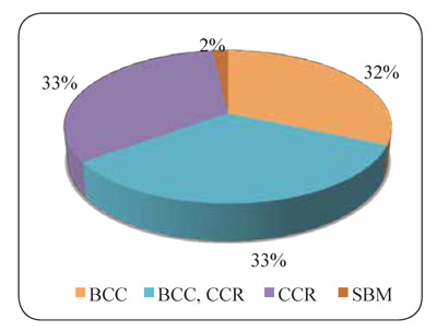En particular, en las 58 investigaciones; 57 emplearon su respectivo modelo de DEA elegidos entre los cuatro modelos identificados en toda la revisión bibliográfica (CCR; BCC; SBM & CCR-BCC); estos modelos fueron enfocados tanto a las entradas como a las salidas (gráfica 13).