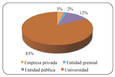 Las universidades, demostrando la importancia de la aplicación de la metodología DEA para generar conocimiento, son las que más estudios han realizado (48 investigaciones). Así mismo, se evidencian 7 estudios por parte de entidades públicas, 2 de empresas privadas y 1 de entidad gremial (gráfica 2).