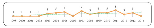 Respecto a la frecuencia de las publicaciones, se encontraron estudios desde el año 1998, incrementándose en el 2003 (4 investigaciones), y con un máximo en el 2011 (8). En general, existe una tendencia positiva (gráfica 3) hacia el uso y aplicación para resolver problemas y proponer optimizaciones en los sectores de la economía colombiana.