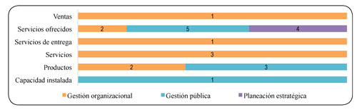 Frente a las salidas (gráfica 21), las organizaciones relacionadas con esta sección muestran dos estudios enfocados en la prestación de servicios públicos, donde se han visto evocadas a optimizar sus procesos, para obtener la rentabilidad esperada de los inversionistas y lograr un control de pérdidas y la calidad del servicio (Rojas, 2011; Tolosa, 2013).