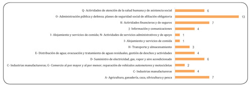 Con respecto a la frecuencia de la implementación de la metodología DEA en las actividades económicas del CIIU, se tiene que las actividades de administración pública y defensa, y planes de seguridad la implementaron en un 22 %; las actividades financieras y de seguros en un 12 %; las actividades de agricultura, ganadería, caza, silvicultura y pesca en un 12 %; las actividades de suministro de electricidad, gas, vapor y aire en un 11 % y las actividades de la salud humana y de asistencia social en un 11 %. De esta manera, estas 5 actividades económicas del CIIU corresponde al 42 % de las actividades CIIU clasificadas por el DAÑE y cuentan con el 70 % de las investigaciones implementando la metodología DEA.