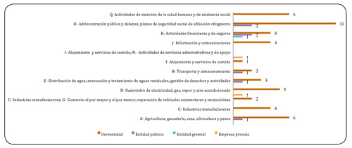 Al relacionar la frecuencia de documentos por sección del CIIU y el tipo de institución que las realiza, las universidades son las que más investigan, seguido de las entidades públicas (gráfica 7).