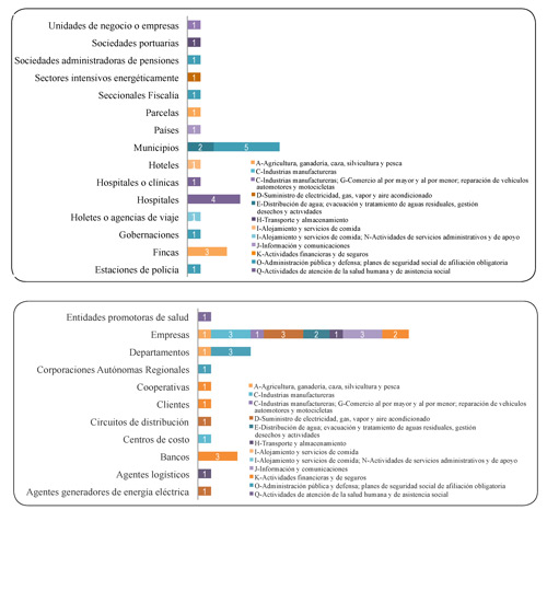 Las DMU más utilizadas en las investigaciones fueron: empresas (16 en ocho secciones), municipios (7 en dos secciones), hospitales (4 en una sección), departamentos del territorio nacional (4 en dos secciones) y bancos (3 en una sección) (gráfica 9).
