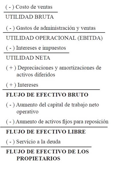 Ha sido costumbre considerar como los estados financieros principales al Estado de la Situación Financiera y al Estado de Resultados, pero además agregan, los Flujos de Efectivo o Cash Flow (Decreto 2649 de 1993 en su artículo 22) en sus 3 variantes: El Flujo de Efectivo Libre (FEL), el Flujo de Efectivo de Capital (FEC) y el Flujo de Efectivo para el accionista (FEA) que reflejan las entradas y salidas de efectivo generado o demandado por la empresa como resultado de cambios producidos en diferentes rubros del Estado de la Situación Financiera y el Estado de Resultados, a través de 3 actividades: operación, inversión y financiación (Jaramillo, 2010; Alzate, 2013) el cual es necesario para su normal funcionamiento, ya que permite la supervivencia o quiebra de una empresa (Saavedra, 2011). Este será la base para calcular el valor de la empresa.