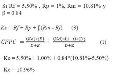 Una técnica utilizada para el cálculo del costo de los recursos propios, se basa en el Capital Asset Pricing Model - CAPM (Parra, 2013); modelo desarrollado por William Sharpe en 1964 y se puede calcular con la fórmula 2 (Armendáriz, 2012; Parra, 2013).