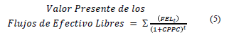Una vez obtenido el Flujo de Efectivo Libre para cada uno de los periodos del pasado y que estos se proyectaran al futuro, se traerá a valor presente o valor actual para cada uno de los t periodos, tomando como base un plazo mínimo de 5 años (el mismo tiempo del horizonte de planeación) y “descontándoles una tasa que incorpore el riesgo inherente” (Fitó, 2015, p.25) que se denomina Costo Promedio Ponderado de Capital, mediante la ecuación (5):