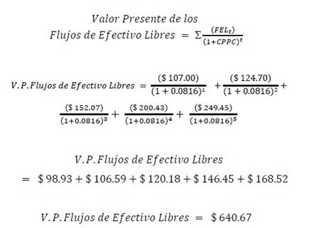 Una vez calculados los valores presentes tanto de los Flujos de Efectivo Libres como del Valor residual de los mismos flujos, se procede a sumarlos, así:
