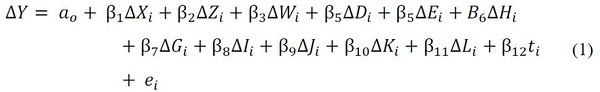 where ∆ is the difference operator. Therefore, ∆Y corresponds to the growth rates of dependent variables and is a constant. Firm size is represented by X, region by Z, economic sector is W, access to credit is D, whether the establishment has its own website is represented by E, sales level by G, whether it is a branch of a larger firm is H, firm’s age is I, whether the firm exports J, international quality certificate of the firm is K, and the absolute sales level in February 2020 is represented by L. The error with zero mean and constant variance is represented by ei .