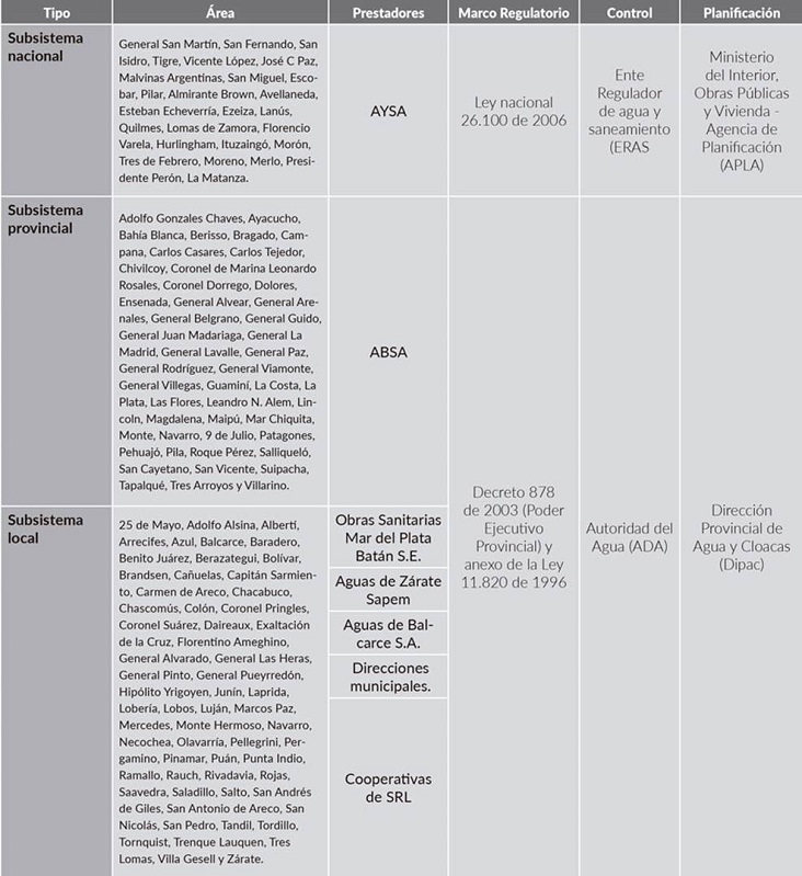 La tabla 1 sistematiza los distintos subsistemas que coexisten en la provisión de agua en la provincia y que tienen como responsable central al Gobierno nacional, provincial o municipal según el municipio e involucran marcos regulatorios y organismos de control diferentes.