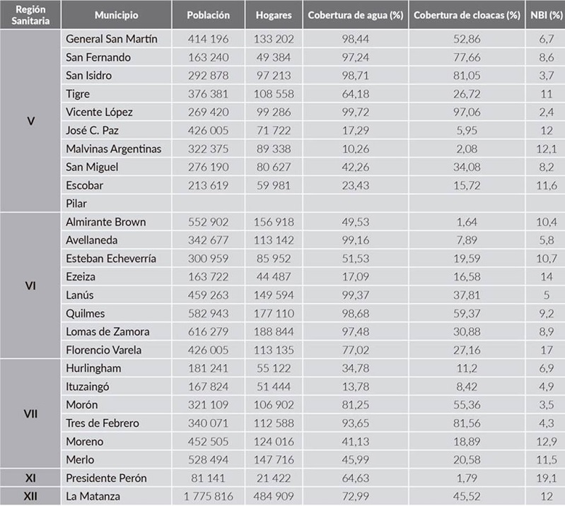 Por un lado hay una parte importante del territorio que incluye a los municipios del Conurbano que, junto a la CABA, conforman la única área del país en la que el servicio no fue descentralizado y en donde la titularidad o autoridad de aplicación de las normativas corresponde aún al Estado nacional. En este territorio, la prestación del servicio de agua está a cargo de una de las empresas del sector más grandes del mundo, denominada AYSA, que, para ubicarla, fue creada en 2006, tras la rescisión del contrato de la empresa Aguas Argentinas S.A. (que hasta 1993 era fue Obras Sanitarias de la Nación), y cuyo capital social corresponde en un 90 % de las acciones al Estado nacional y un 10 % al personal mediante el programa de participación accionaria gestionada por el sindicato. El organismo responsable del seguimiento de la calidad del servicio en esta área, actualmente, se denomina ERAS, un organismo autárquico e interjurisdiccional regulado por el anexo de la Ley 26.221, mientras que el responsable de la planificación de las obras de expansión del servicio se denomina APLA. La empresa AYSA tiene la responsabilidad de proveer de agua a 26 municipios que corresponden a las regiones sanitarias V, VI, VII y XII de la provincia, y en donde se observa el mayor déficit acumulado en materia de cobertura de agua y de cloacas (tabla 2). Los municipios de José C. Paz, Malvinas Argentinas, Moreno, Merlo, Florencio Varela, San Miguel, Escobar y Presidente Perón fueron incorporados a AYSA recién en 2016, y Pilar en 2018; justamente en ellos es donde se observa un notorio déficit e indicadores socioeconómicos complejos en materia de NBI.