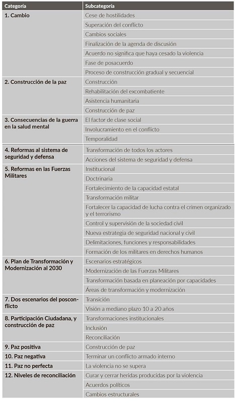Las representaciones sociales sustentan los procesos sociales de construcción y reconstrucción de la realidad, en este caso referidos al tema de la paz en el posconflicto y a la forma en que se transformará el contexto del país, la institución y la vida de los militares.