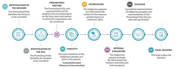 The Regulations of the Law on Prior Consultation, approved by Supreme Decree No. 001-2012-MC, provide, between Articles 14 and 23, that prior consultation has seven stages: