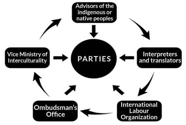 Although these seven stages are well established, we can see that between the second and third stages there is a preparatory meeting which, although it doesn’t consist of another stage in the proper sense of the word, will determine the way in which the consultation will take place. Regarding the actors that participate in this process of prior consultation, articles 5 and 8 of the Law of Prior Consultation recognize the indigenous peoples as part of the process, as well as the promoting entity, which can be an entity of the local, regional or national government. However, since it is a process that has several stages, and since intercultural dialogue has certain requirements for its effective implementation, there are other relevant actors that interact with the parties throughout the process, as can be observed in Figure 2.