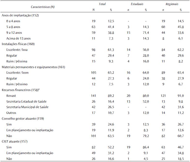 Em geral, os CEREST tinham pelo menos cinco anos de funcionamento, sendo que suas estruturas físicas, de equipamentos e materiais permanentes foram consideradas boas, constituindo fator favorável ao seu bom funcionamento. No entanto, com relação a esse aspecto cabe considerar que, mesmo que a maioria tenha relatado possuir infraestrutura adequada para esses fatores, um percentual expressivo de centros (mais de um terço entre os regionais e quase a metade entre os estaduais) referiram condições inadequadas; assim, esse é um aspecto que ainda merece atenção dos órgãos gestores.