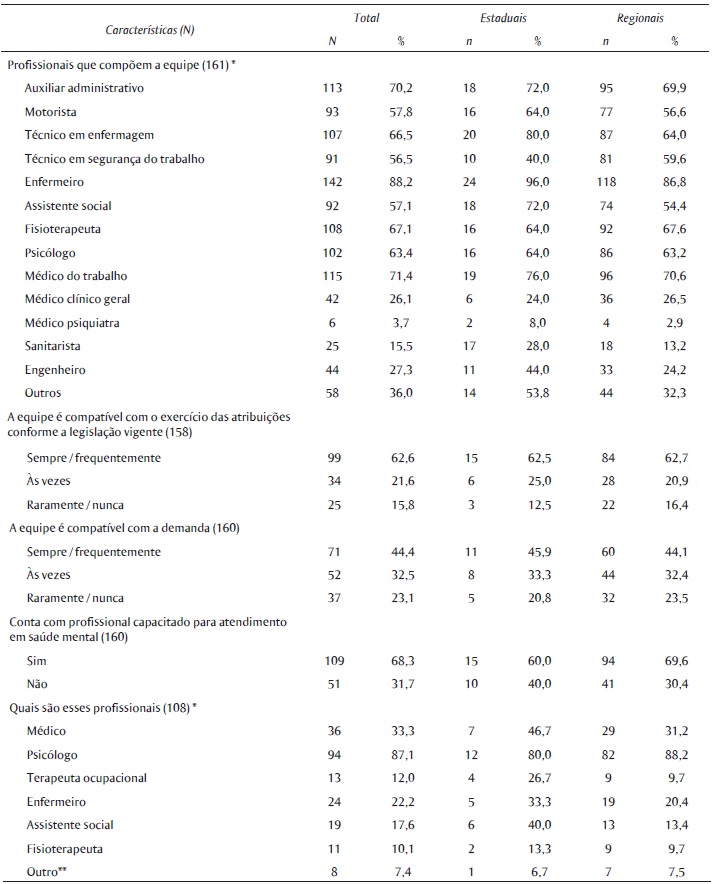 Quanto aos recursos humanos, a categoria enfermeiro foi aquela com maior frequência entre as profissões que faziam parte dos profissionais dos serviços de abrangência estadual (96,0%) e regional (86,8%), seguida pelos médicos do trabalho (percentual de 76,0% e 70,6%, respectivamente). Quando questionado aos respondentes sobre sua avaliação em relação à compatibilidade da equipe profissional com o exercício das atribuições do serviço, conforme a legislação vigente, a maioria descreveu que era sempre ou frequentemente compatível, com percentuais de 62%. Contudo, na avaliação da equipe em relação à demanda da área de abrangência, essas proporções baixaram significativamente entre os estaduais (45,9%) e regionais (44,1%) (Tabela 2).