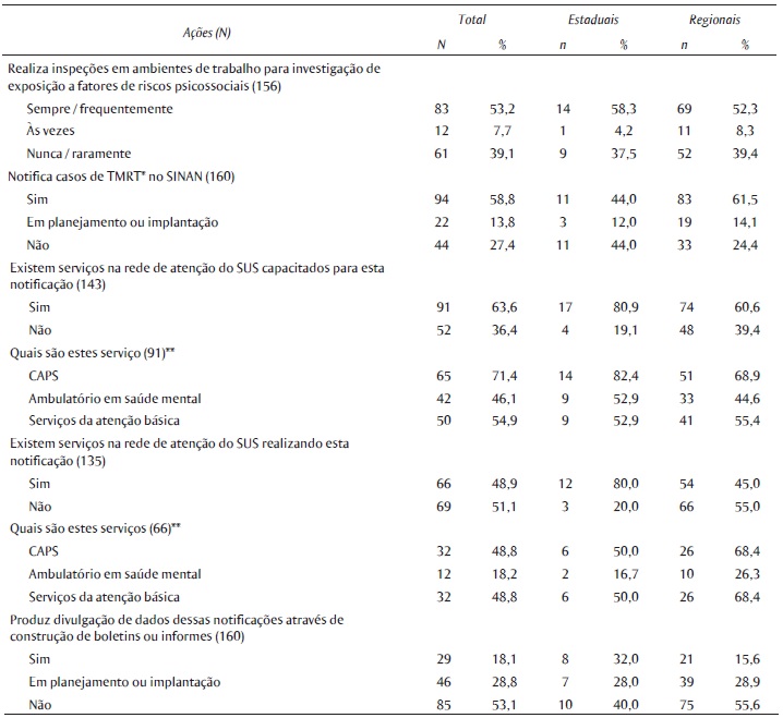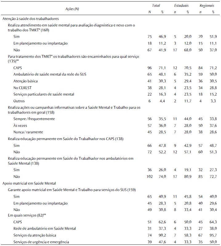 Conclusão: observou-se que as ações na área de saúde mental relacionadas ao trabalho realizadas pelos CEREST ainda são incipientes.